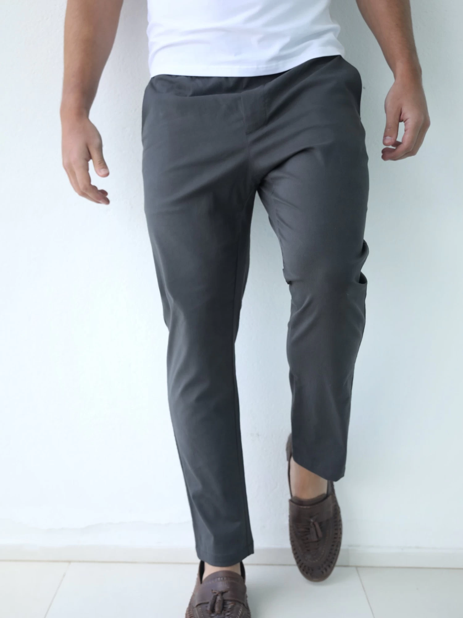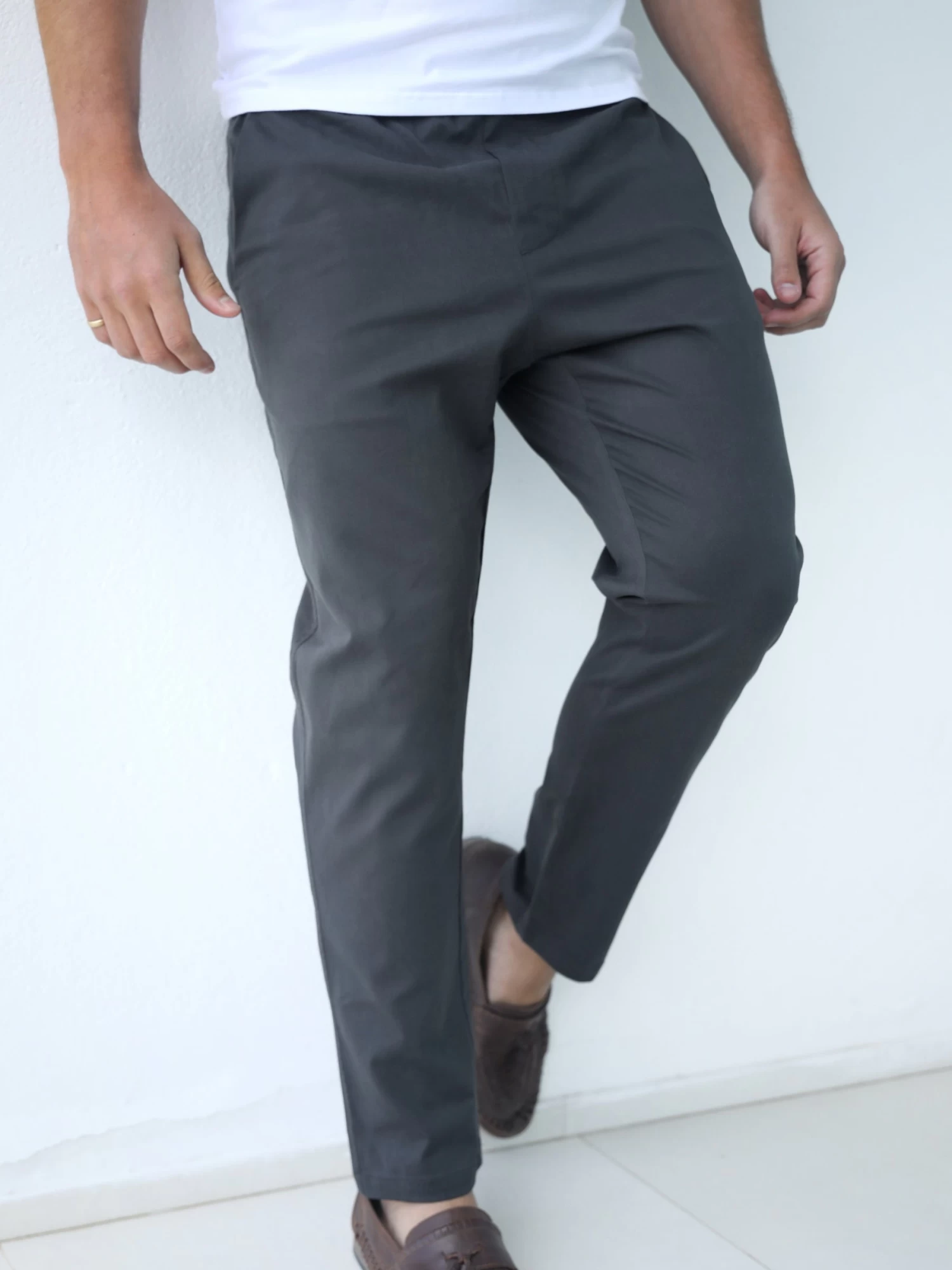 The Amalfi Trousers in grey, feature a slim fit design with a tapered cut, a drawstring waist and side pockets. Style these trousers up or down depending on the occasion.