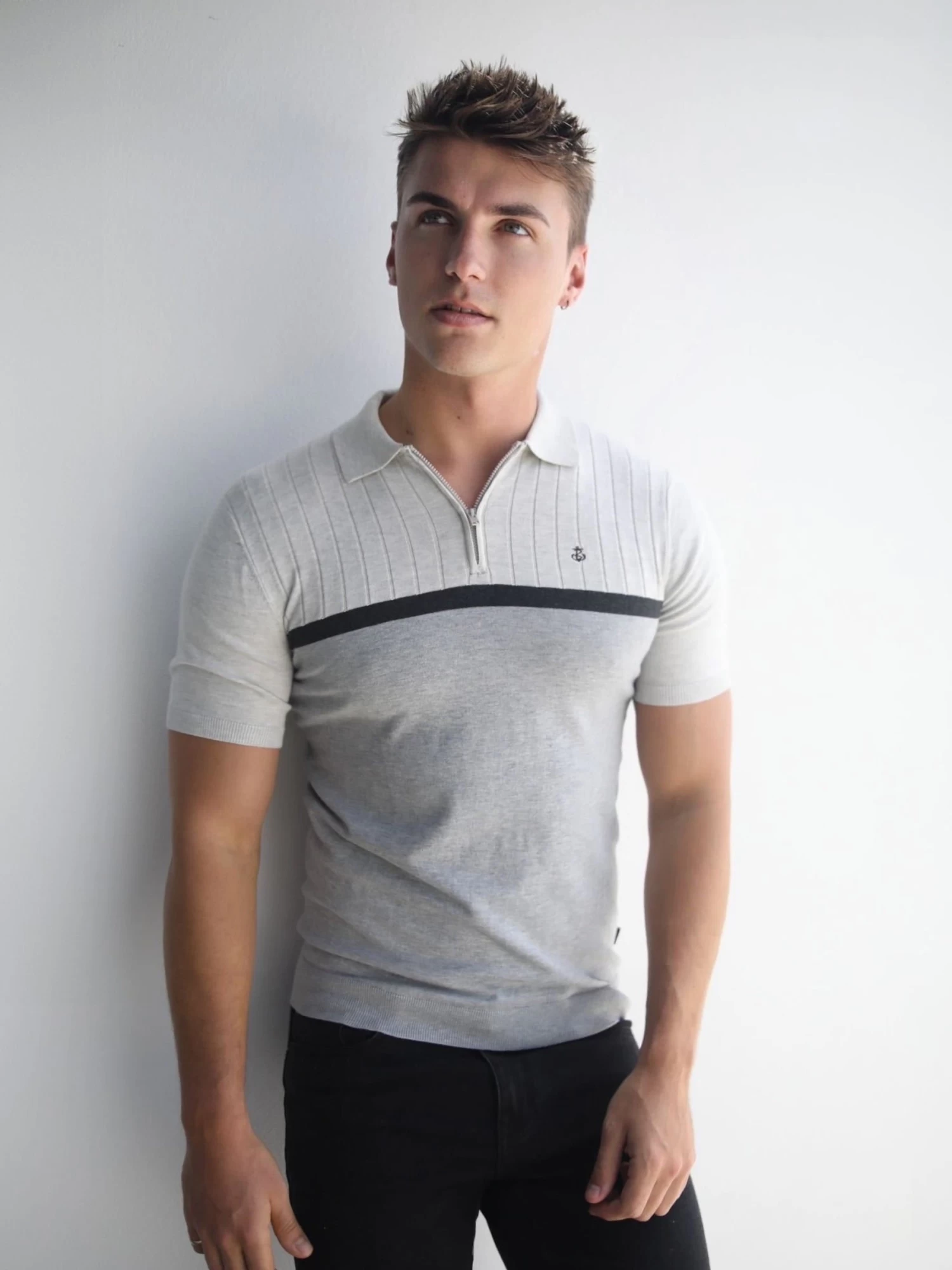 The Antonio Polo in grey has a slim fit with ribbed texture at the top and variation in colour throughout. It features a zip polo collar and is finished with an embroidered Anchor logo in black on the chest, as well as ribbed hem and cuffs.