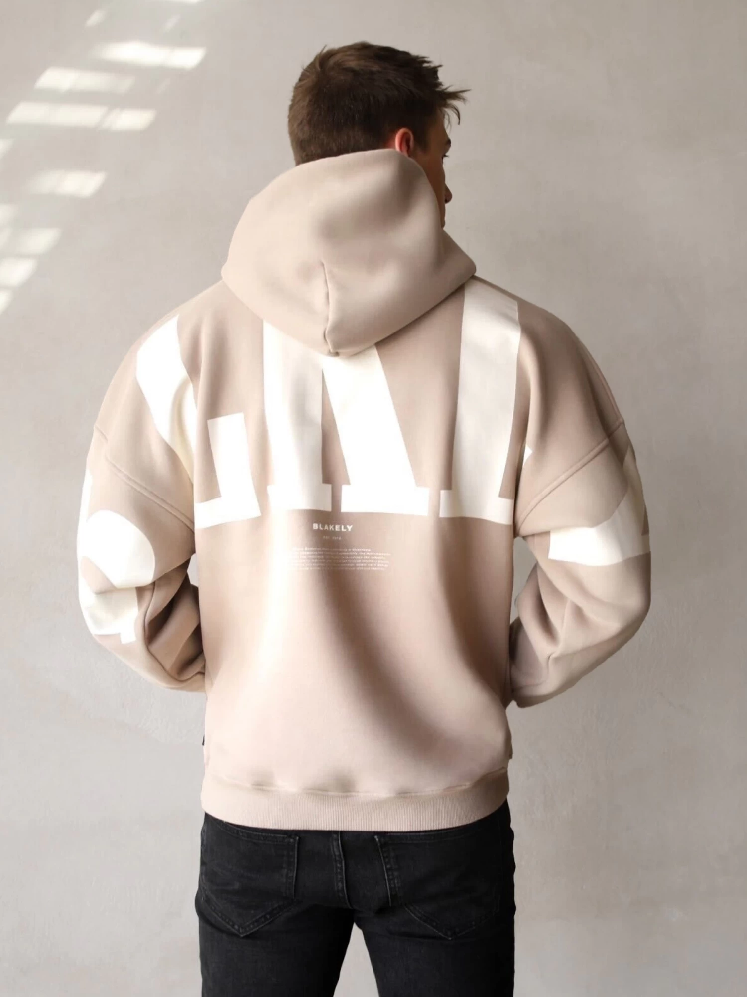 The BLKLY Hoodie, in tan, is made from a soft cotton blend with a relaxed fit. It includes a ribbed hem, cuffs, and a screen-printed logo in off-white on the back.