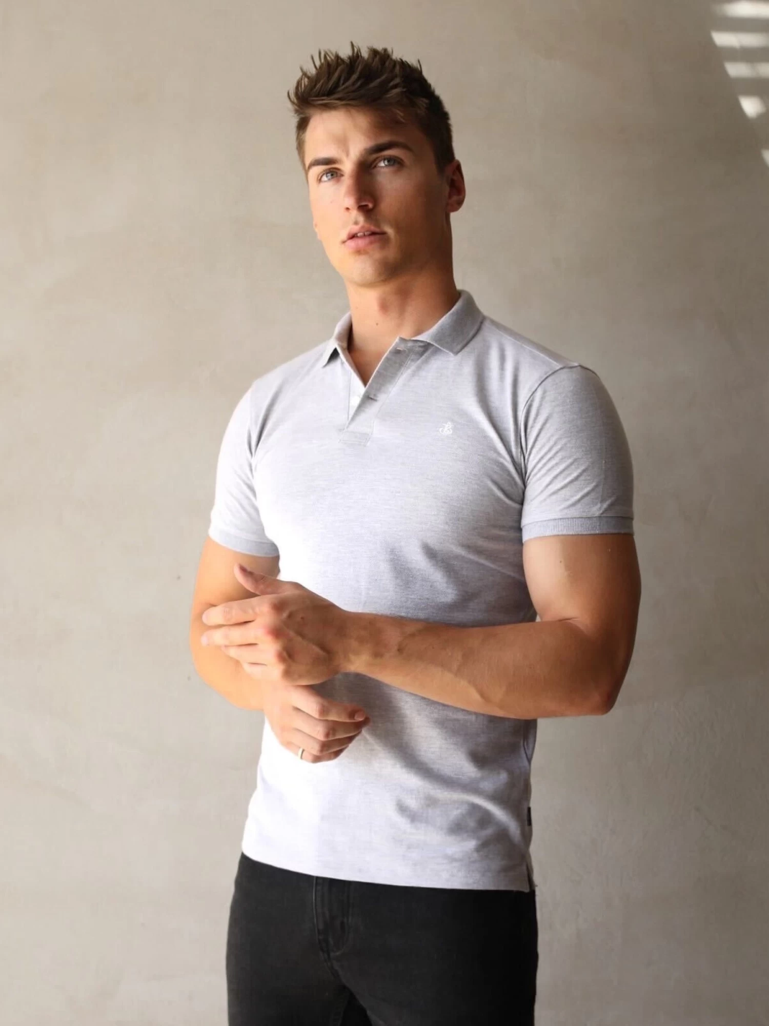 Our Burton Marl Polo in marl grey has a slim fit and is made from a soft cotton blend. It features short sleeves, a summary-up neckline, and our Blakely Anchor branding in black on the chest. We have elevated our classic polo design with a marl texture.