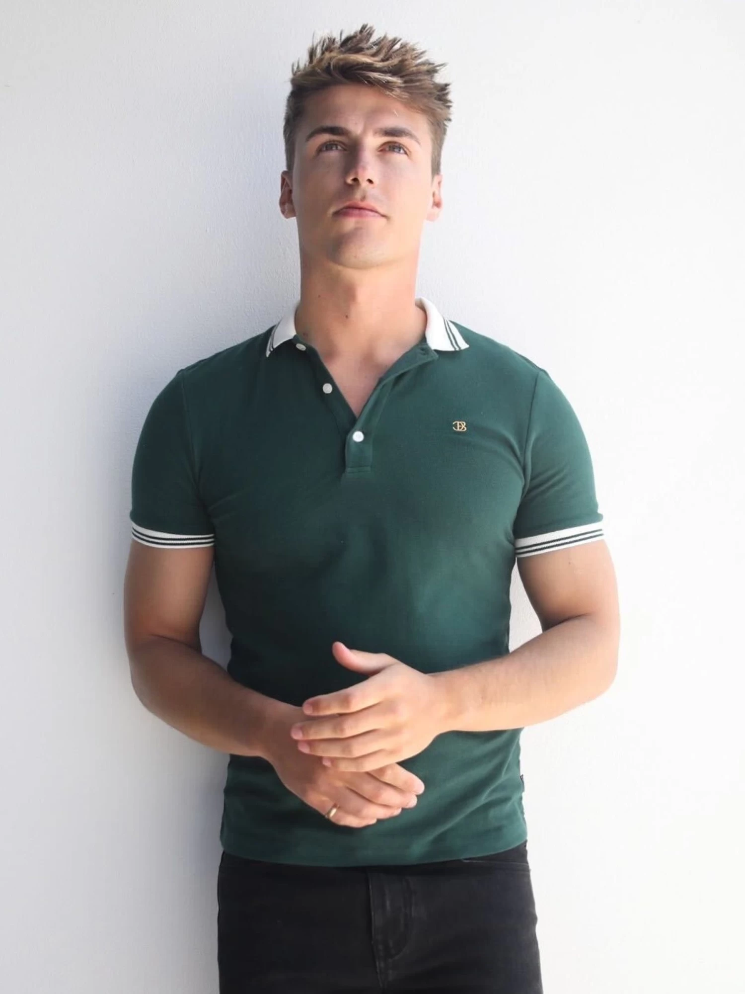 Our Dalston Polo, in green, has a slim fit, summary-up neckline, and contrasting detailing on the collar and sleeves. It is crafted from a soft cotton fabric and finished with short sleeves and a gold embroidered Blakely Initial logo on the chest.