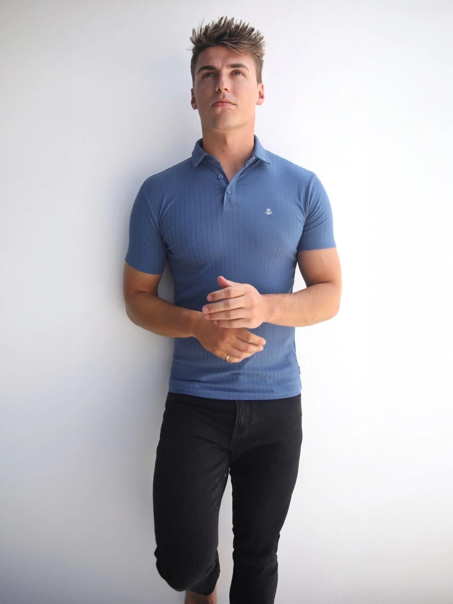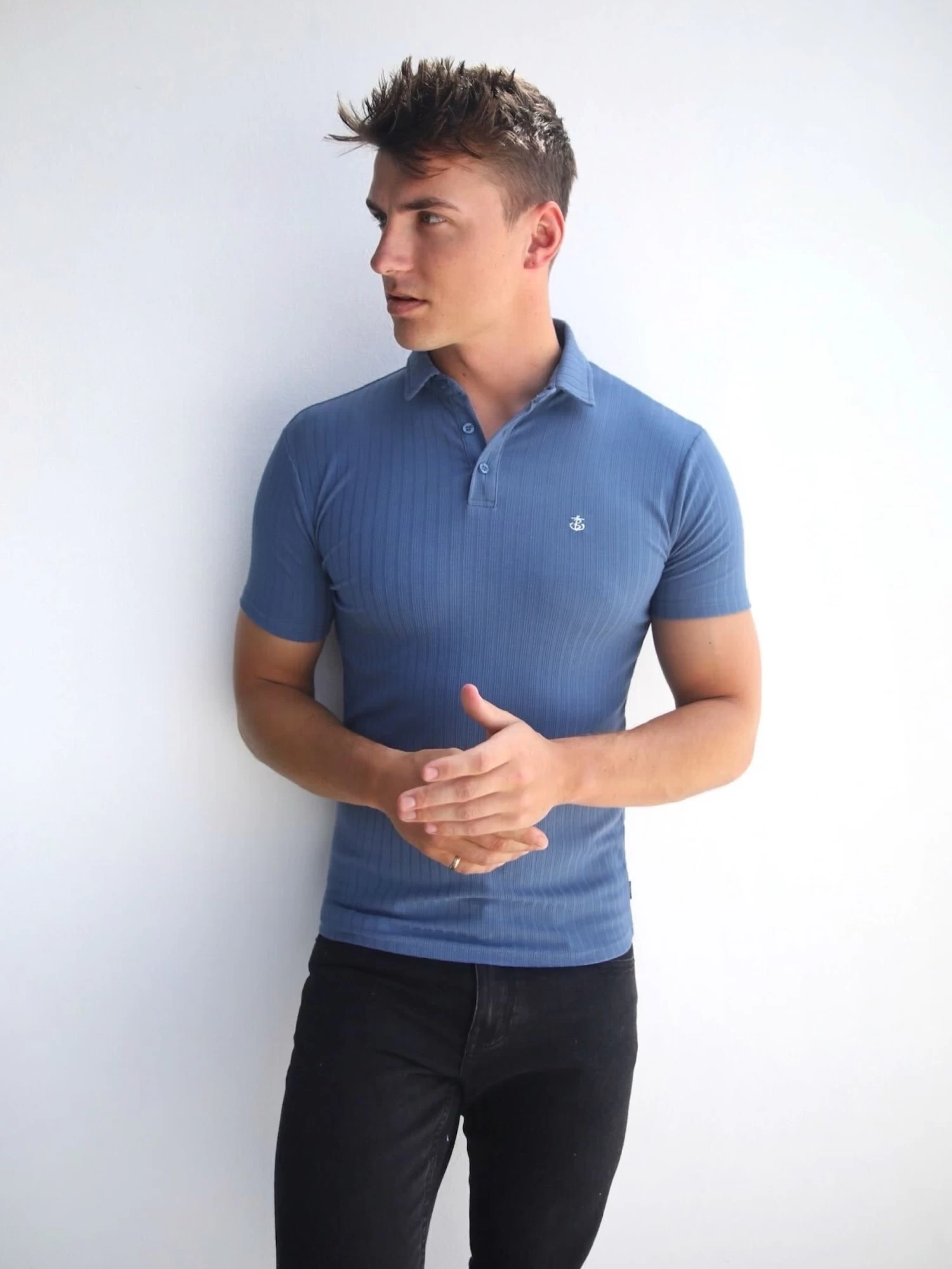 The Franco Polo Shirt in blue has a slim fit, with a subtle ribbing texture, and short sleeves. It has a summary-up polo collar and is finished with an embroidered Anchor logo in white to the chest and a branded tab to the side seam.