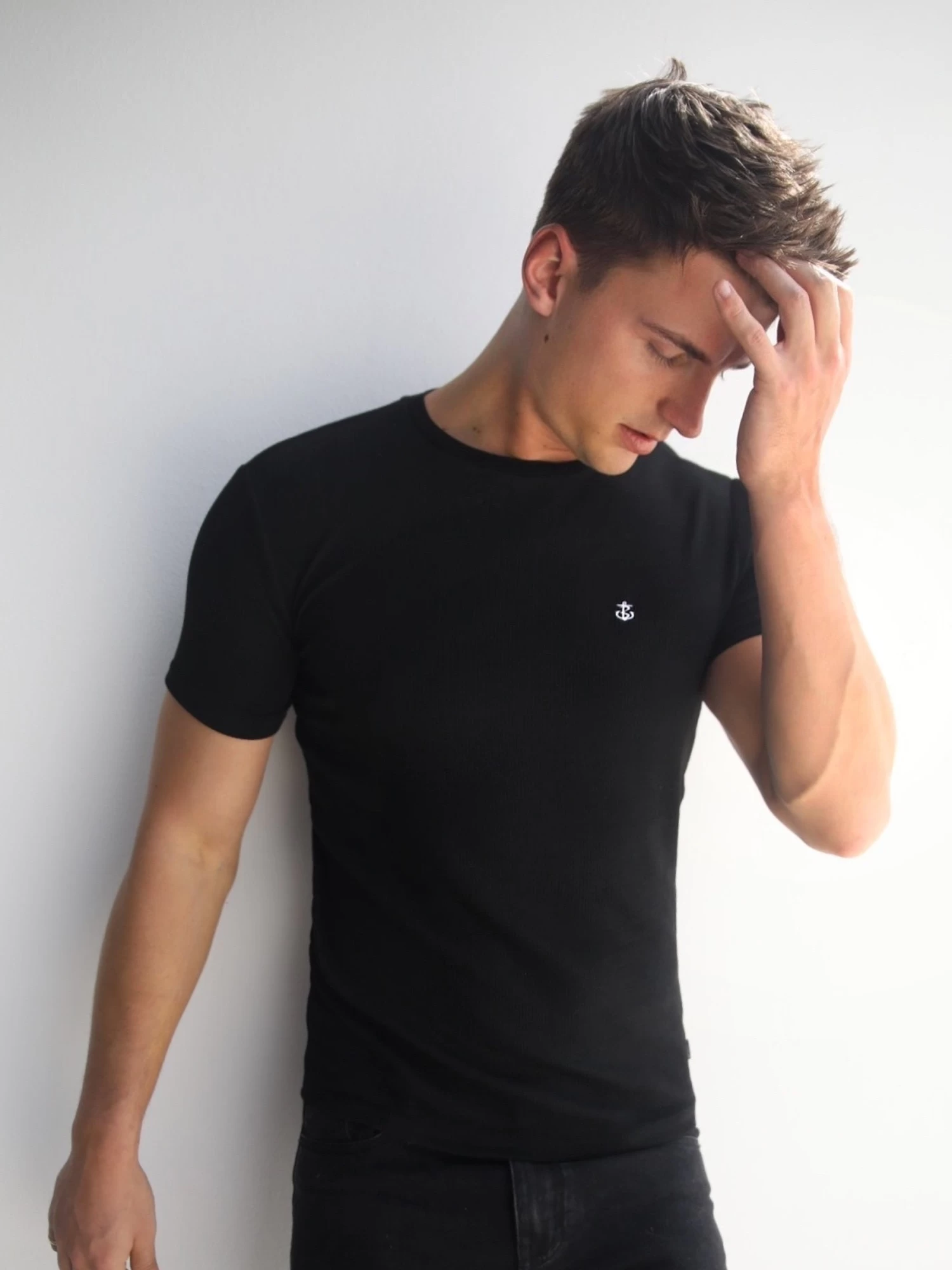 The Pirlo T-Shirt in black has a slim fit with a subtle ribbed texture and short sleeves. It features a crew neck collar and is finished with a white embroidered Anchor logo on the chest and a branded tab on the side seam.