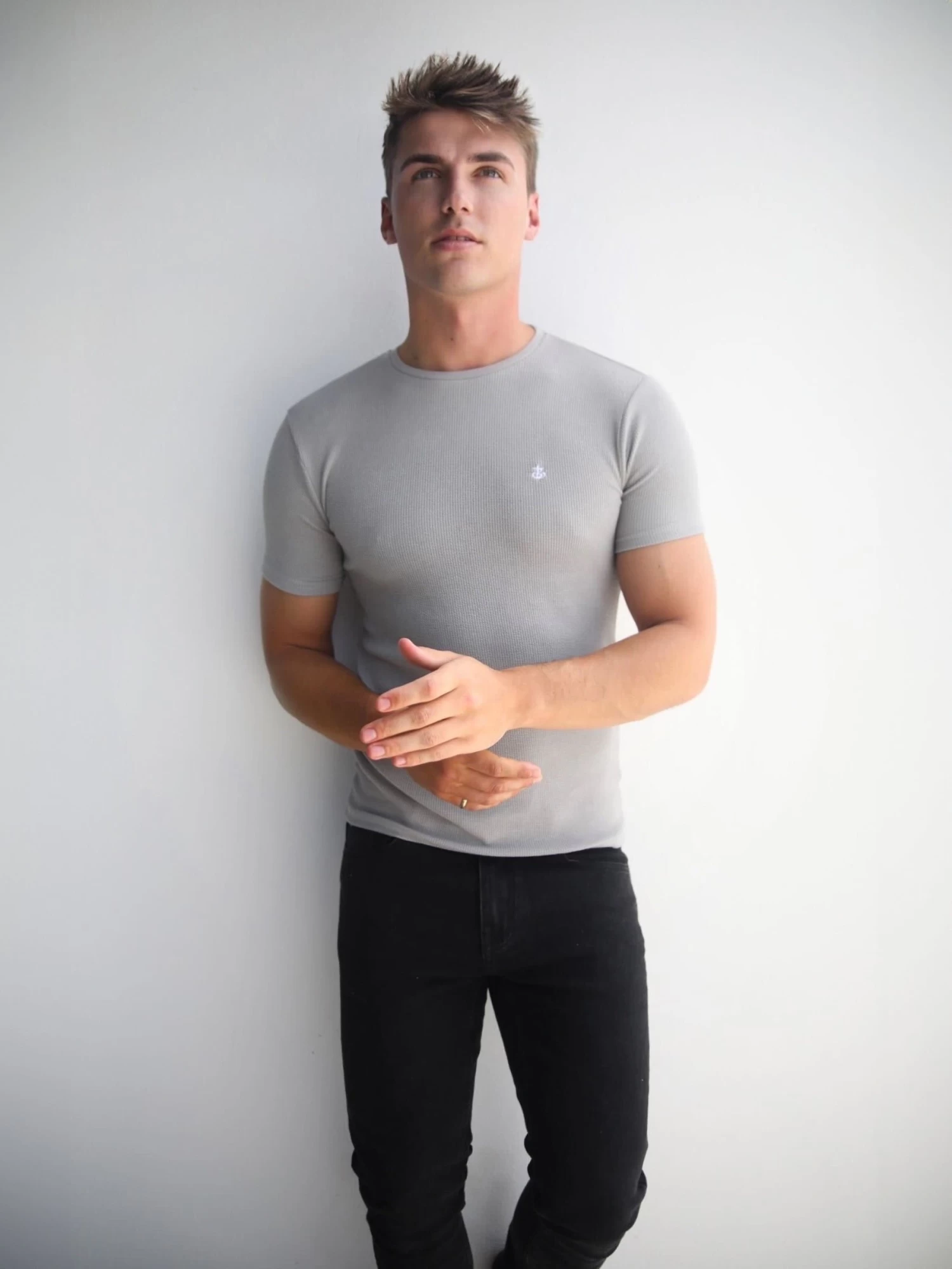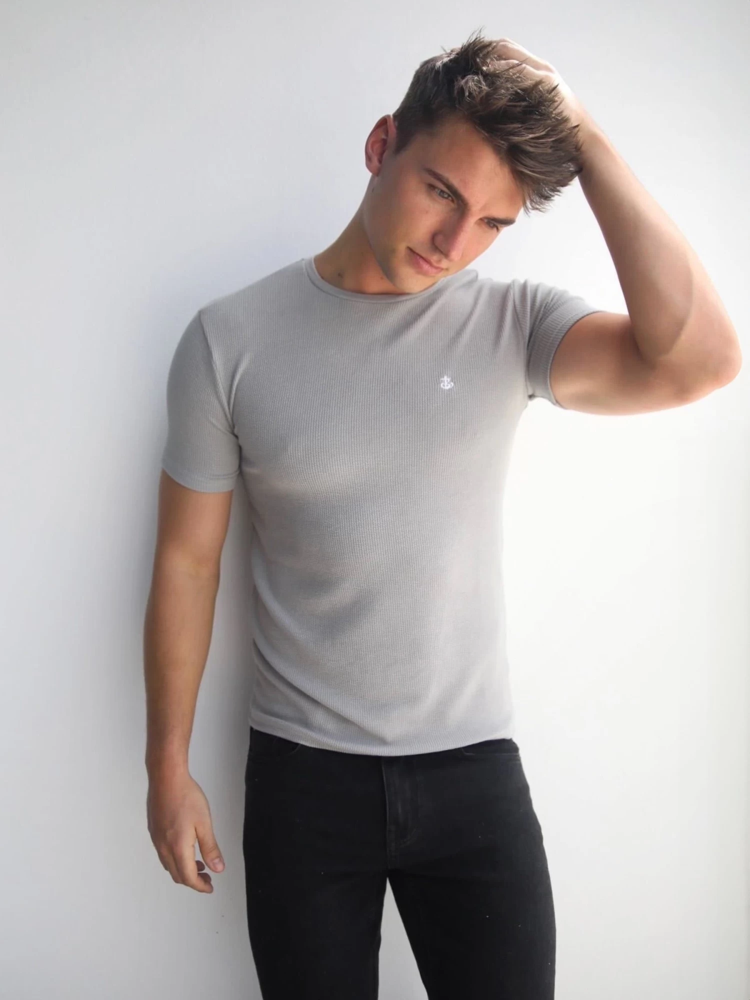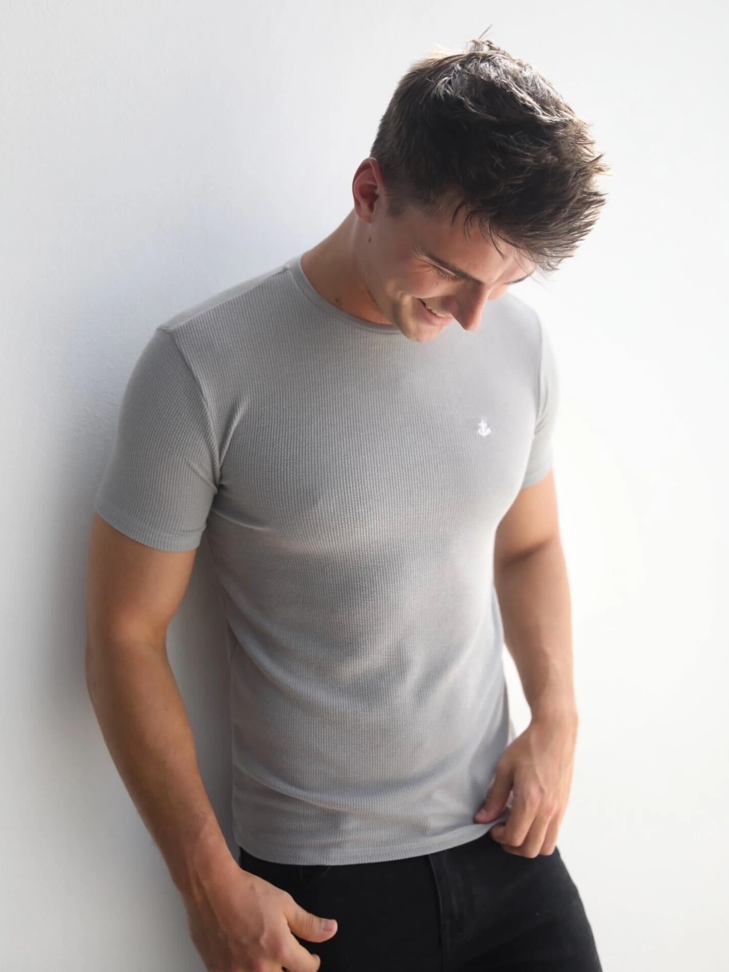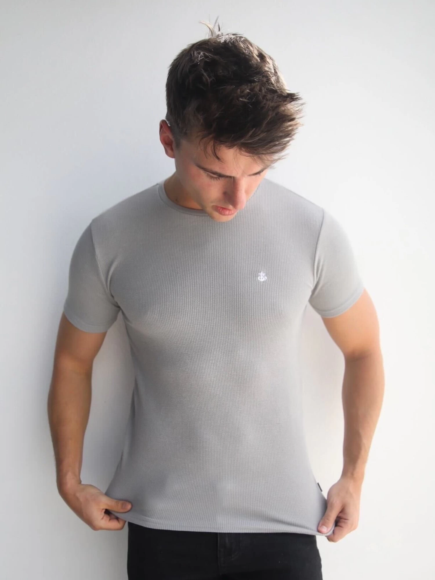 The Pirlo T-Shirt in grey has a slim fit with a subtle ribbed texture and short sleeves. It features a crew neck collar and is finished with a white embroidered Anchor logo on the chest and a branded tab on the side seam.