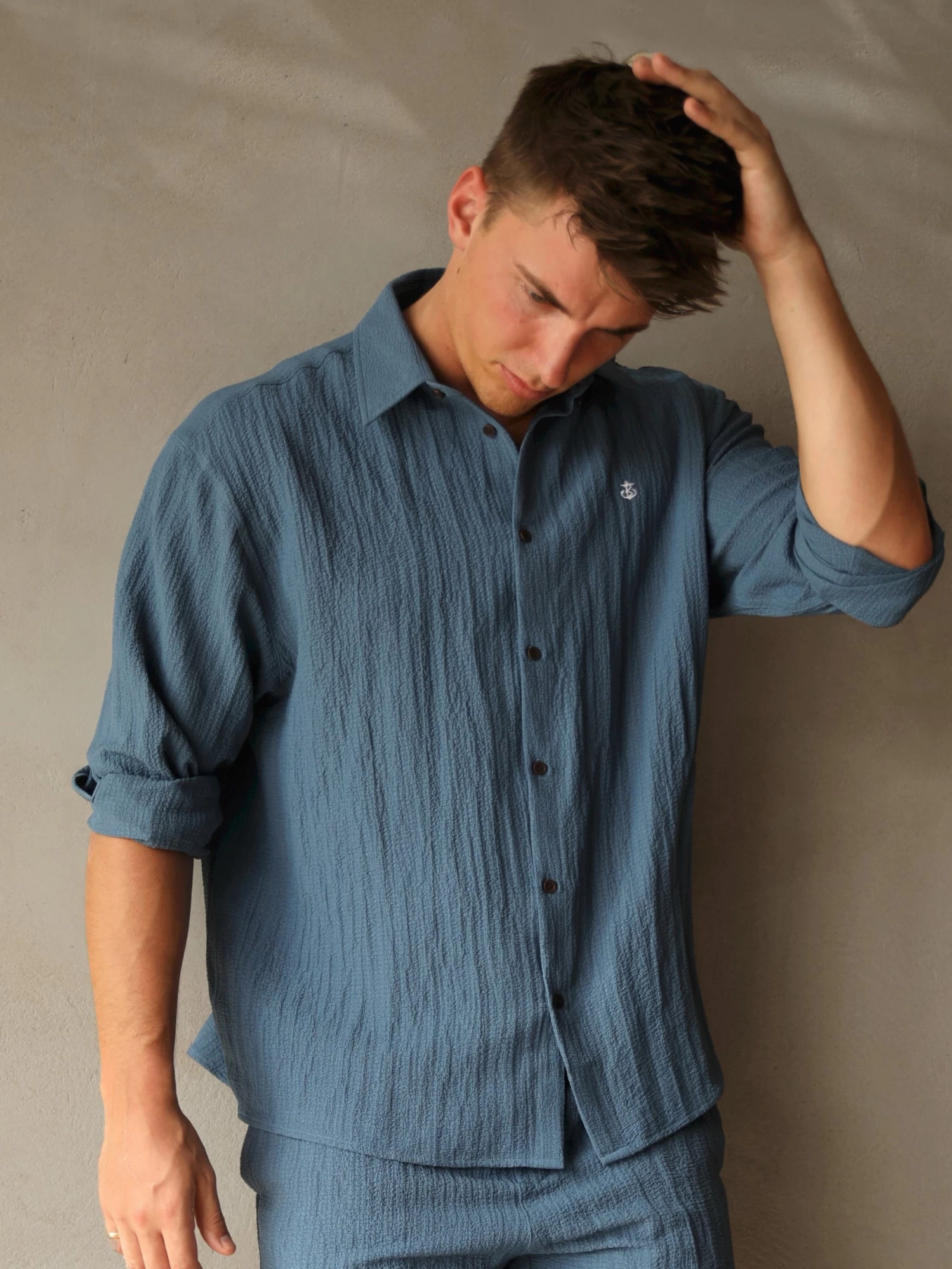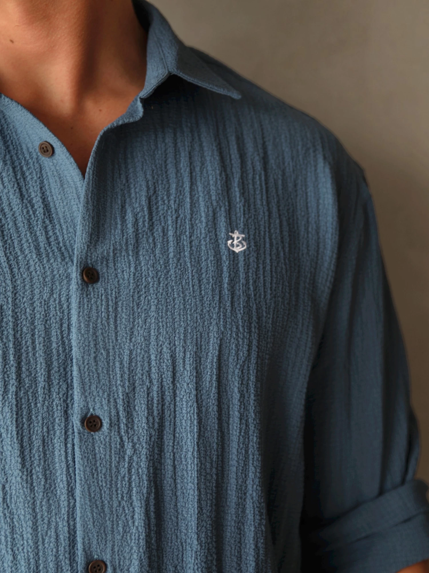 Introducing the Salvatore Shirt in blue. It has been made from a breathable crinkled fabric and features a slightly relaxed fit. It has been finished with an embroidered Blakely Anchor logo, long sleeves, and a full-summary up design.
