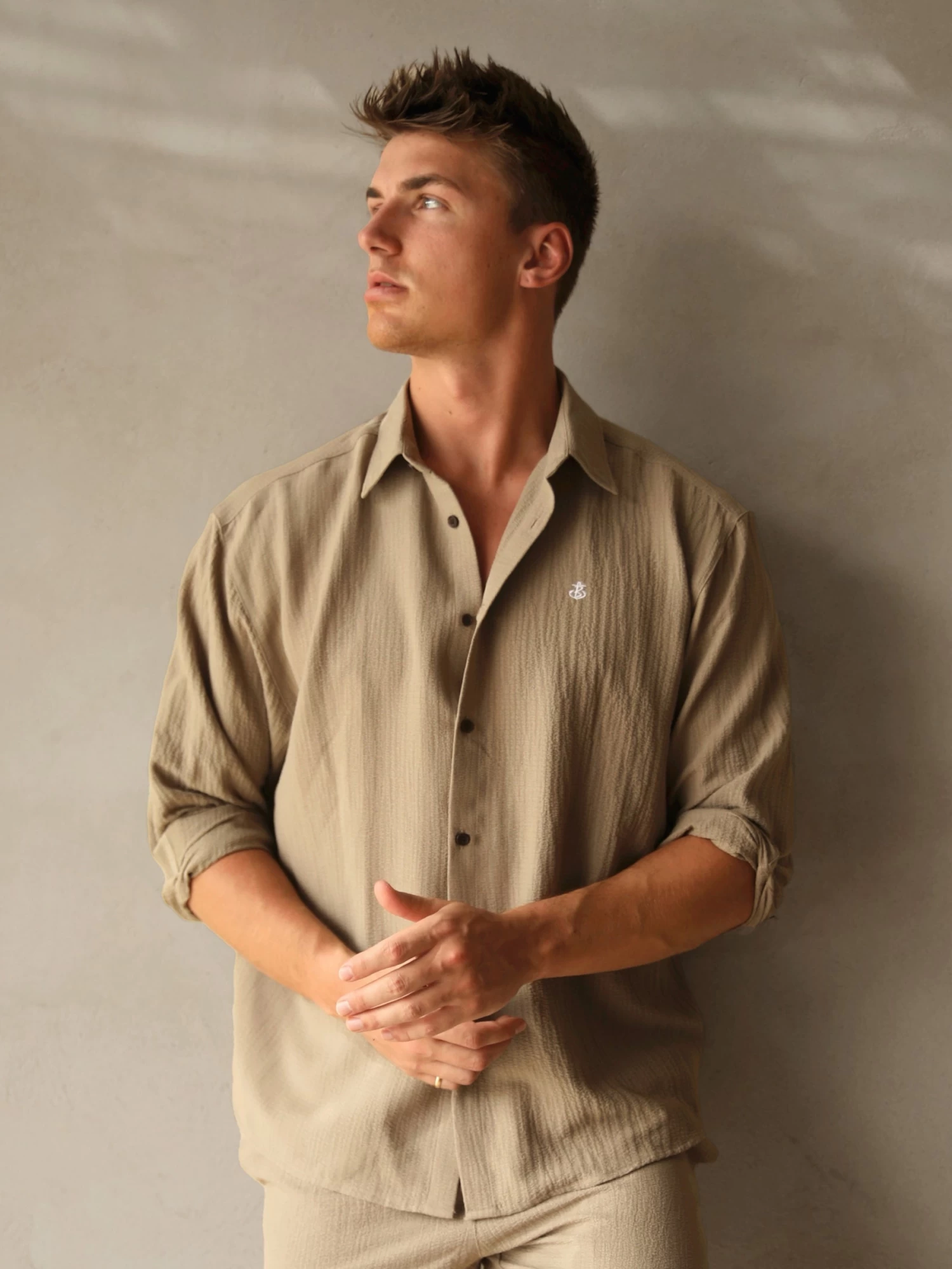 Introducing the Salvatore Shirt in tan. It has been made from a breathable crinkled fabric and features a slightly relaxed fit. It has been finished with an embroidered Blakely Anchor logo, long sleeves, and a full-summary up design.