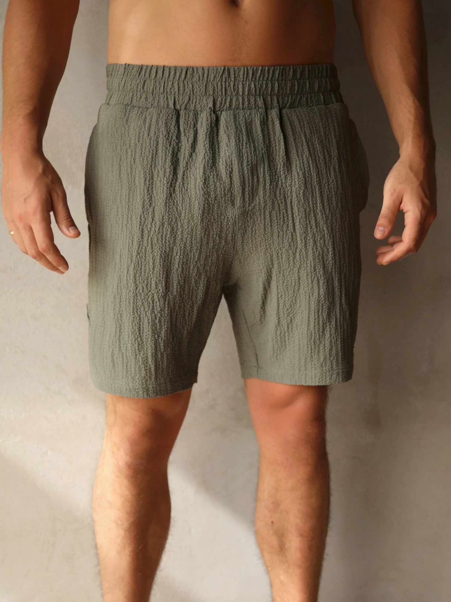 Introducing Salvatore the Shorts in khaki. They are made from a breathable crinkled fabric and feature a slightly relaxed fit. The shorts are finished with an embroidered Blakely Anchor logo, side pockets, and an elastic waistband.