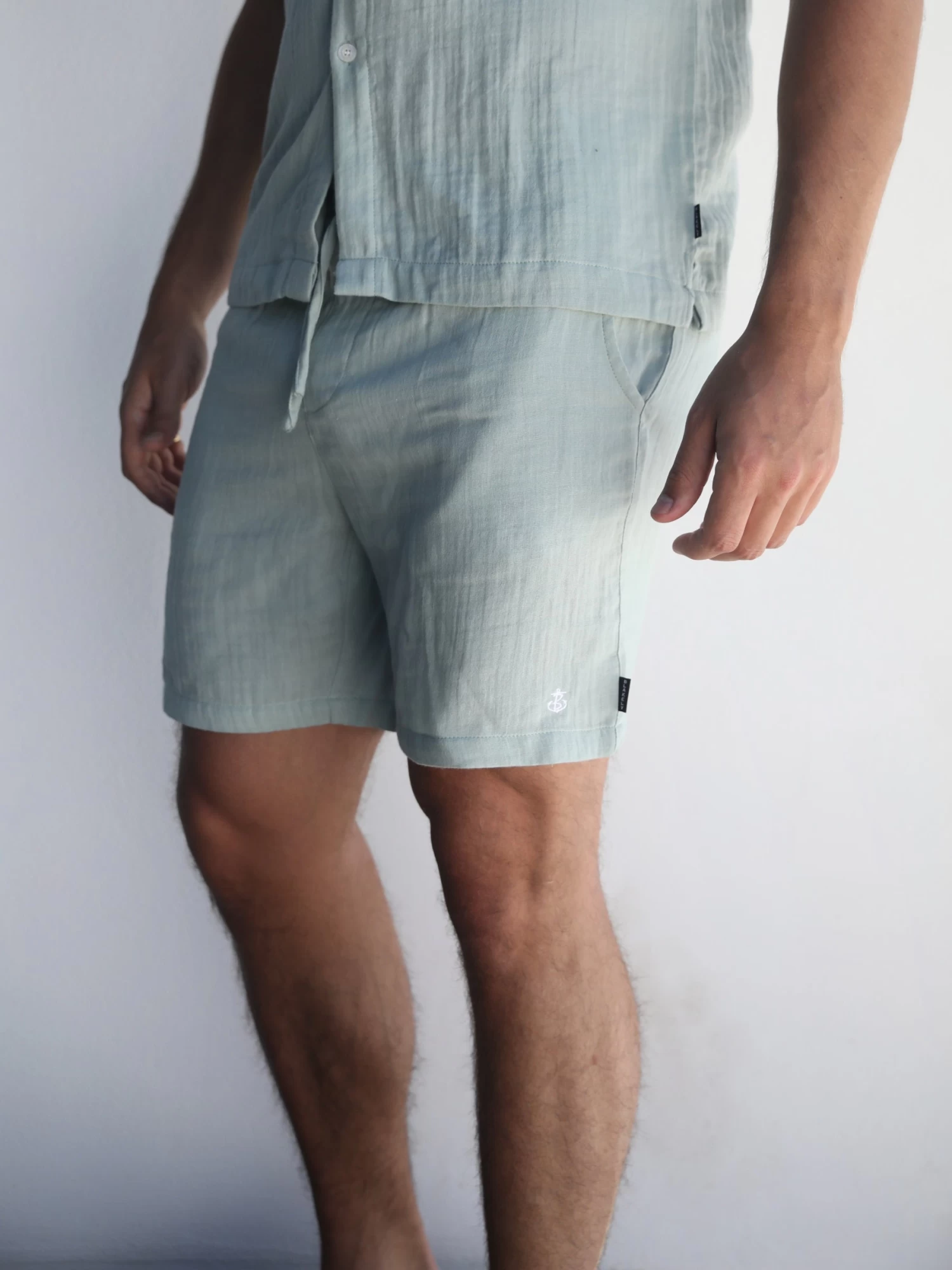 Introducing the Siena Shorts in sage green. They are made from a breathable textured fabrication and have a slightly relaxed fit. These shorts have been finished with a embroidered Blakely Anchor logo, side pockets, and an elastic waistband.