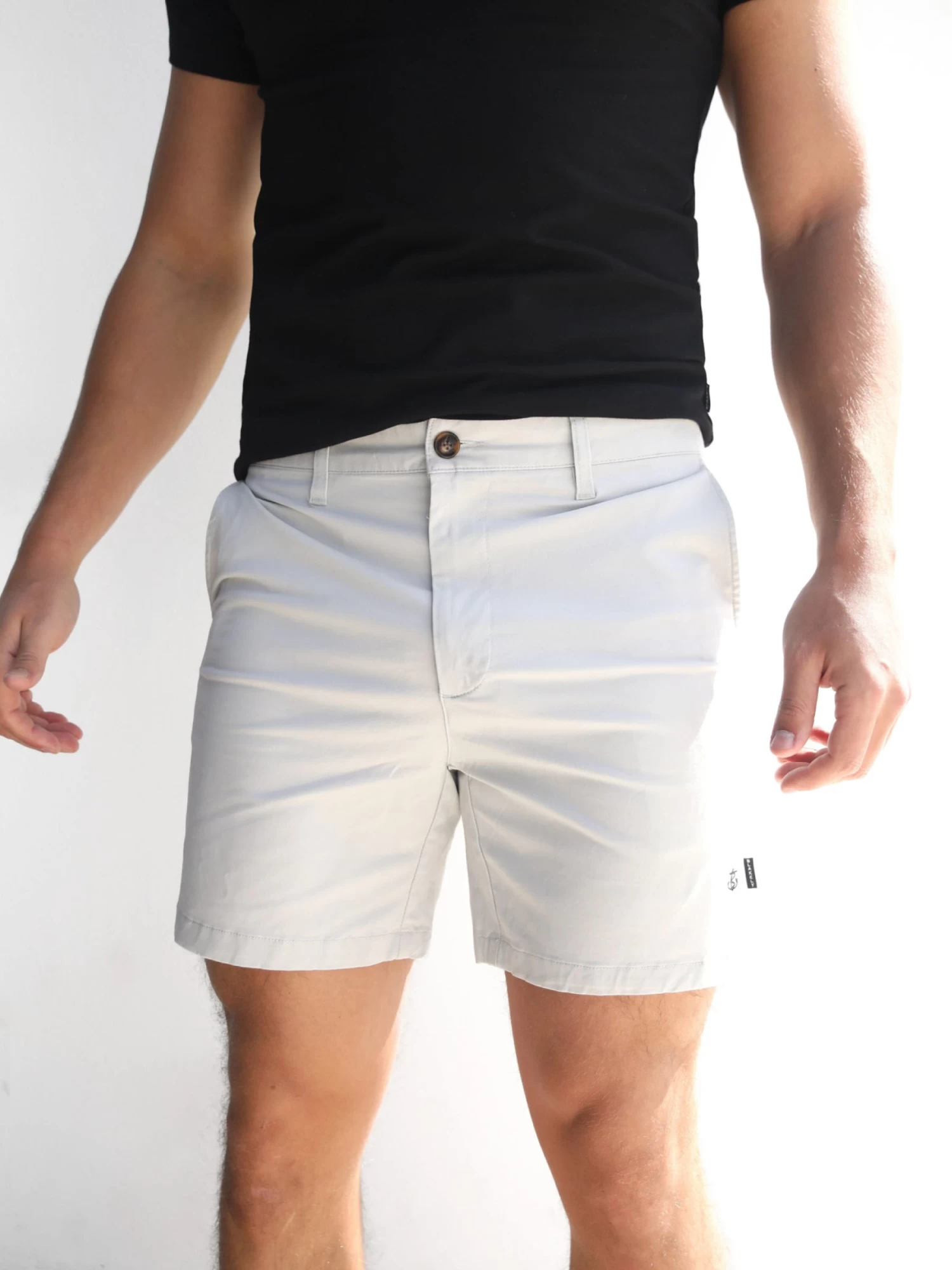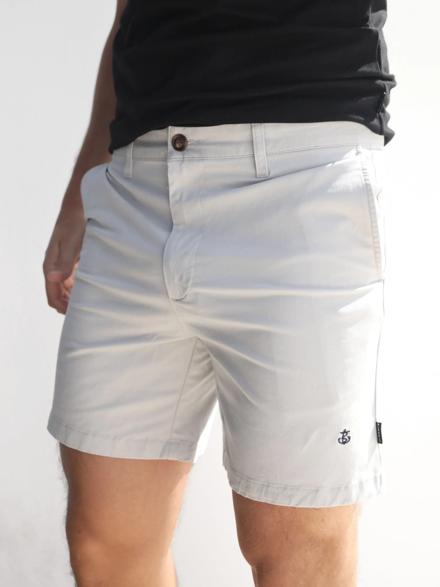 Our Stretch Chino Shorts in light grey are made from a cotton twill fabrication. They have a longer leg with a streamlined fit that tapers towards the knee. These shorts come in a variety of colours and are finished with an Blakely Anchor logo in navy embroidered on the leg.