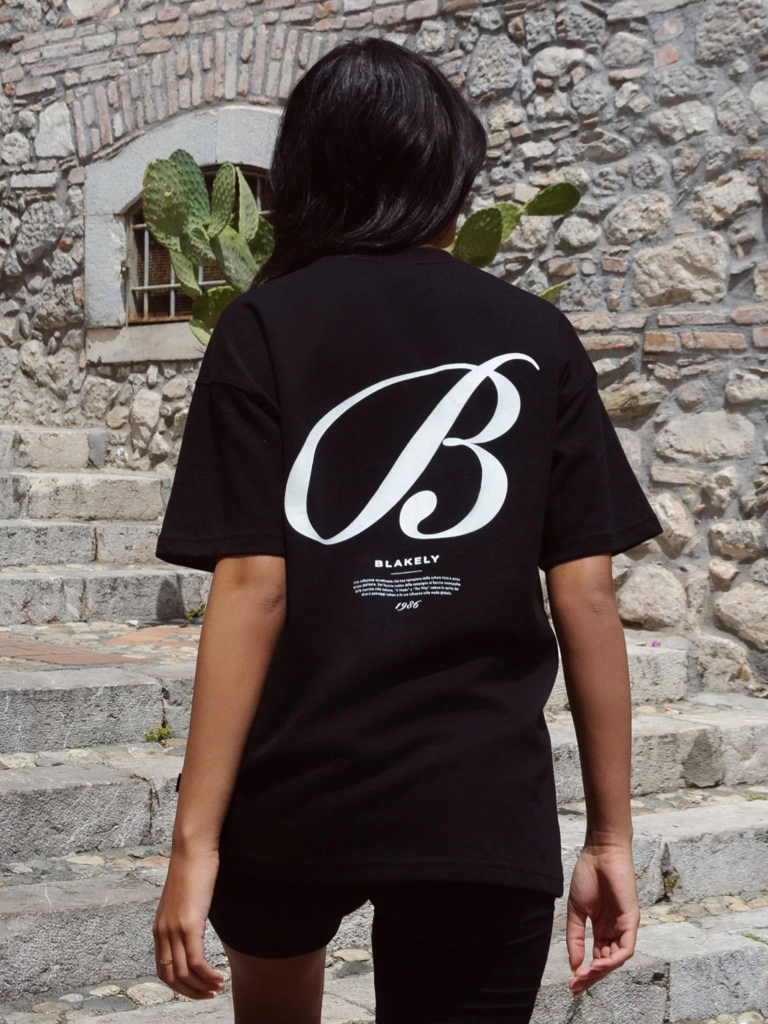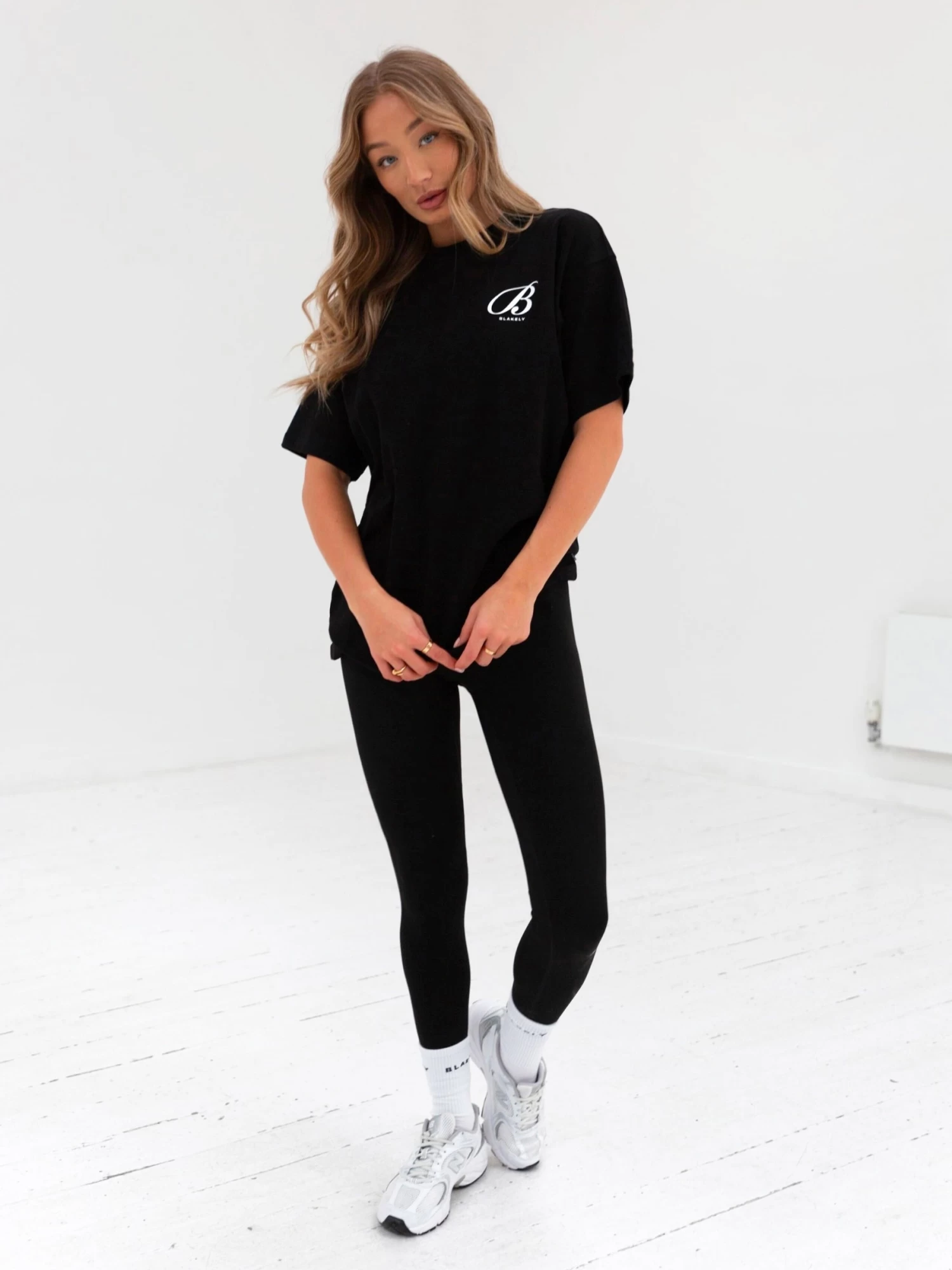 The Vita T-shirt in black is crafted from a cotton blend with a oversized fit. It has a crew neck collar and is finished with a graphic print in flat white on the front & back.