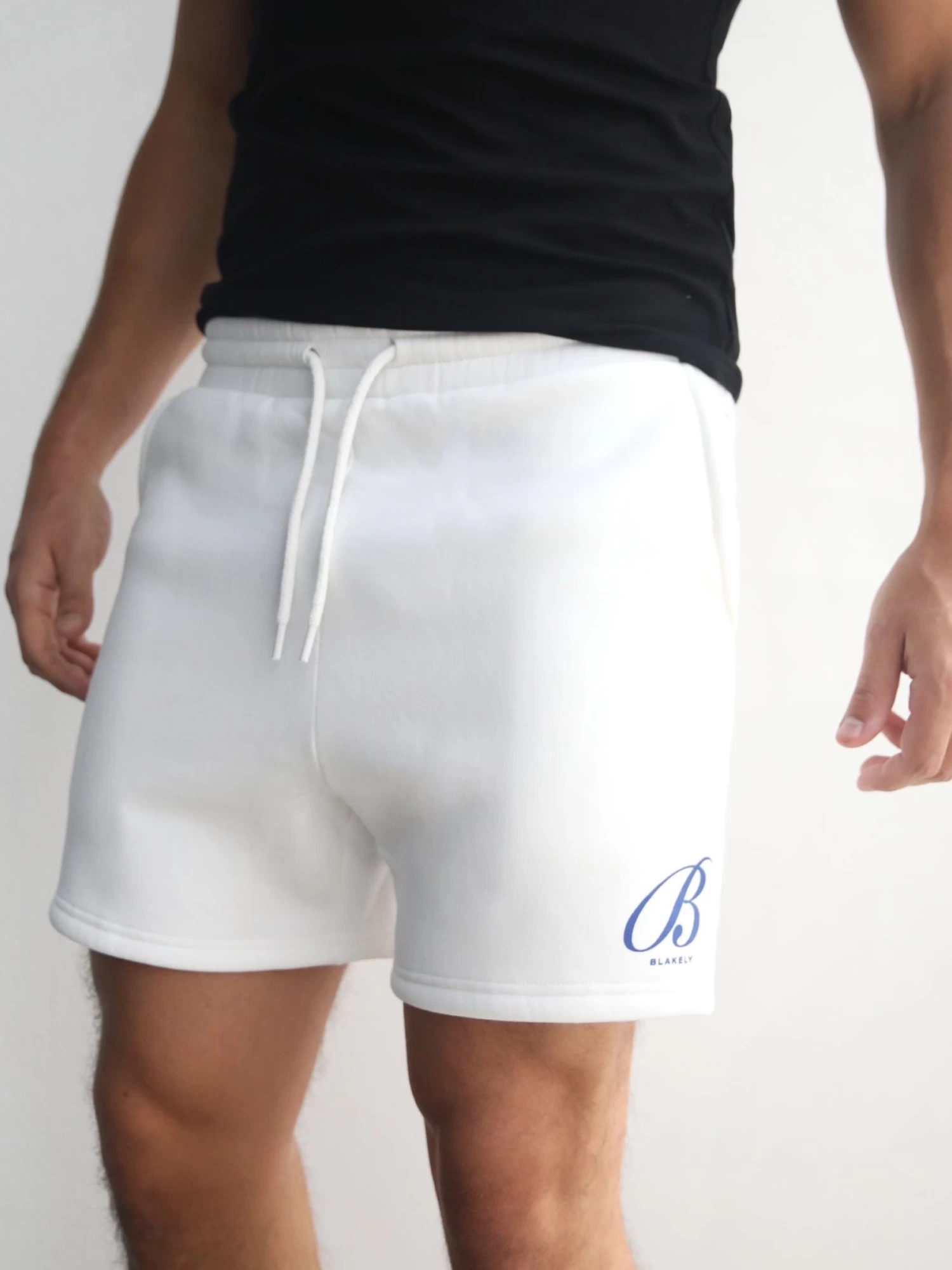 The Vita Shorts in flat white are crafted from a cotton blend with a slightly relaxed fit. They have side pockets and an elasticated waist and are finished with a graphic print in cobalt on the front.